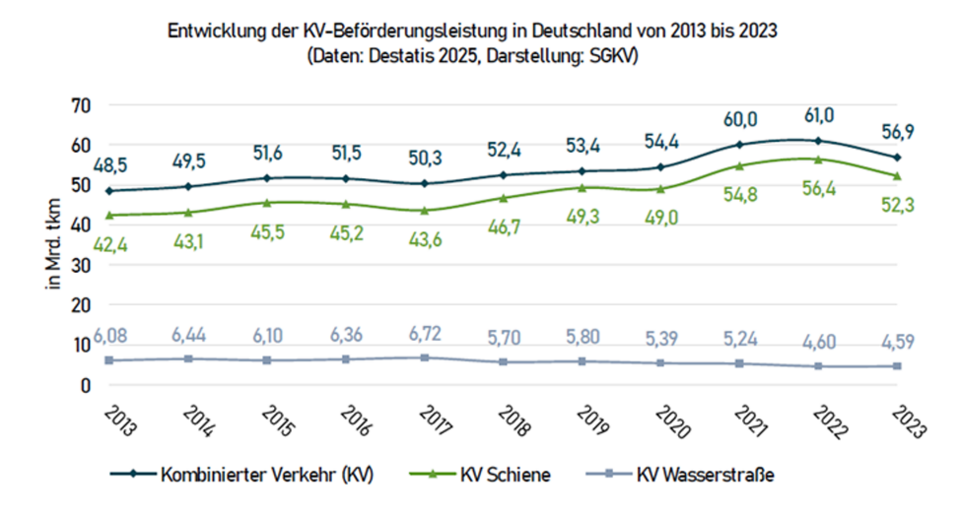 Der Kombinierte Verkehr hat zwar nur rund 2,6 % Anteil an der Gesamtgütermenge – doch seine Bedeutung geht weit über diesen geringen Prozentsatz hinaus. Mit über 41 % Anteil an der Beförderungsleistung im Schienengüterverkehr zeigt er deutlich, wie stark die Schiene im intermodalen Kontext bereits genutzt wird. Wird dieser Verkehrsteil nun zurück auf die Straße verlagert, dann bedeutet das: